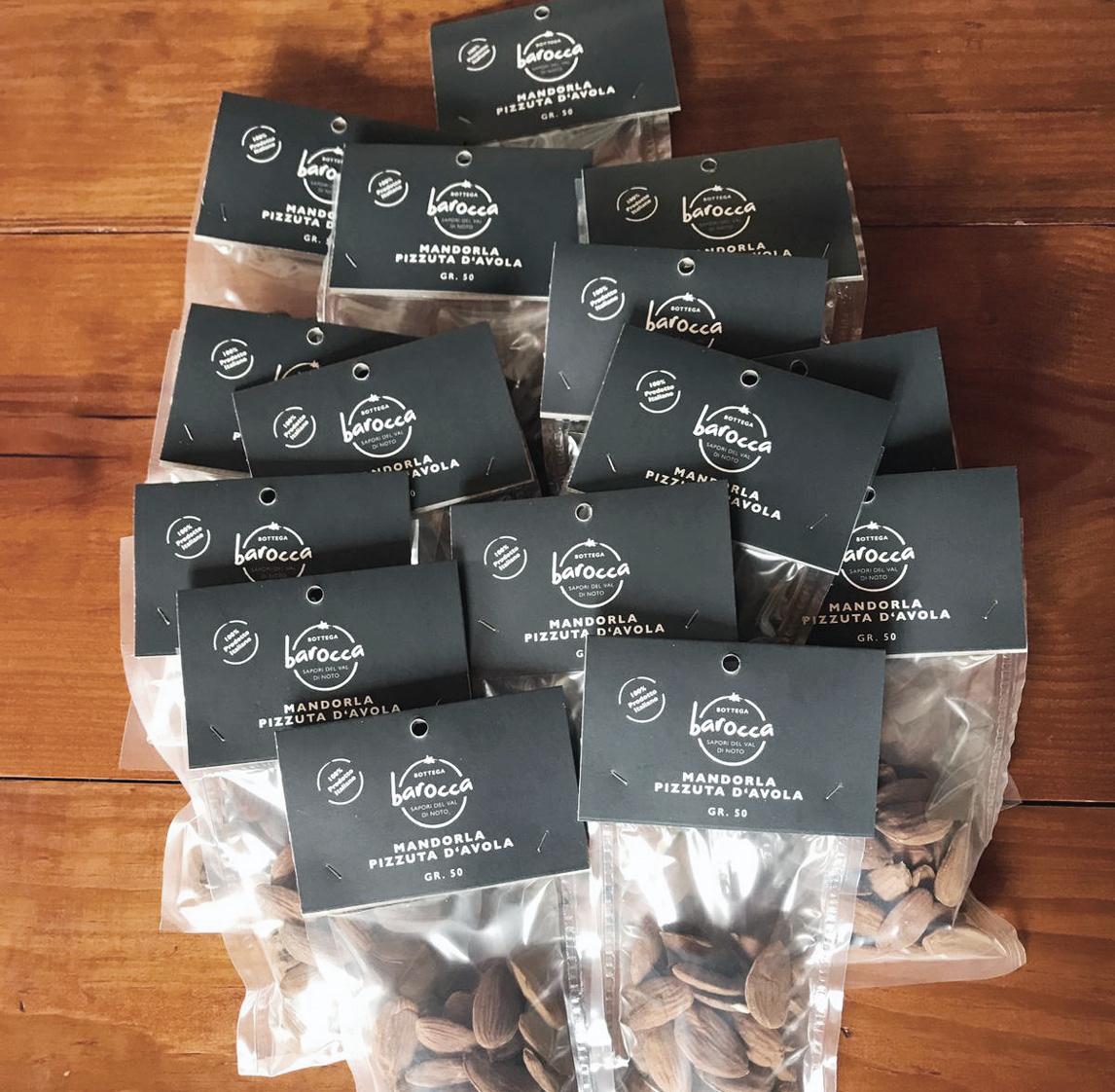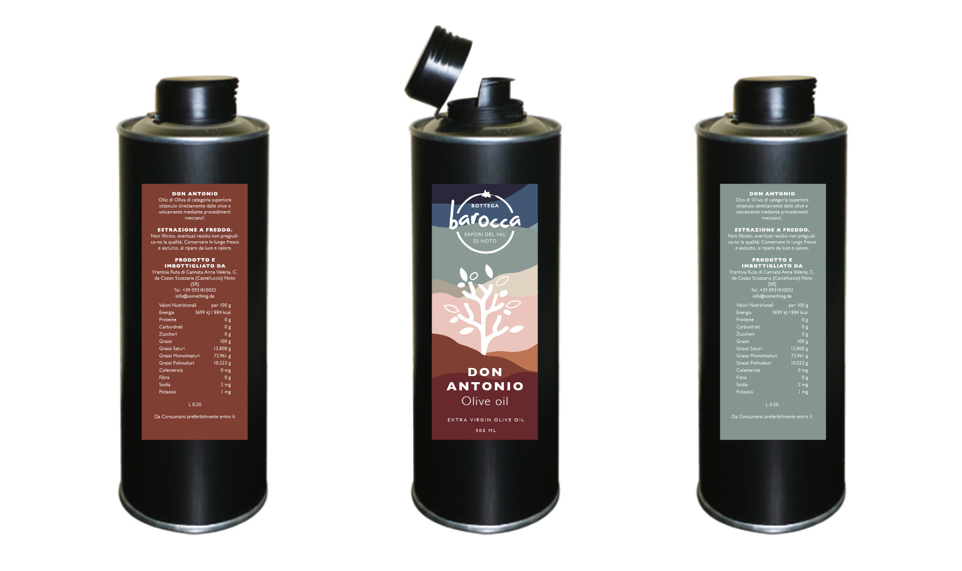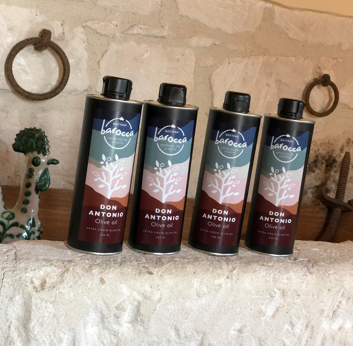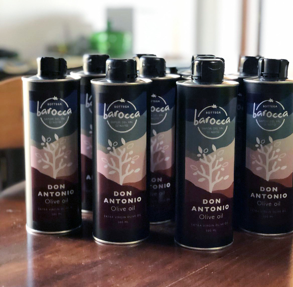 Brand development. Logo and packaging design for Bottega Barocca in Noto, Sicily. The Bottega Barocca attaches great importance to traditional harvesting and processing of the olives for Don Antonio oil and almonds and stands for Sicilian quality and love for nature.