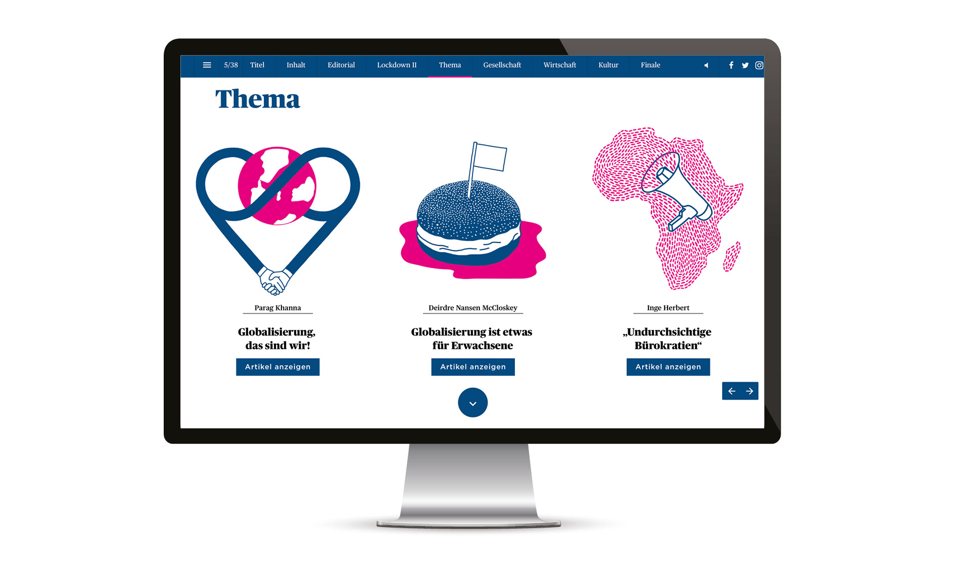Art Direction for Liberal Magazine 04/2020 "GLOBALISIERUNG – JETZT ERST RECHT!" from the Friedrich-Naumann-Stiftung für die Freiheit. Agency: Einhorn Solutions.