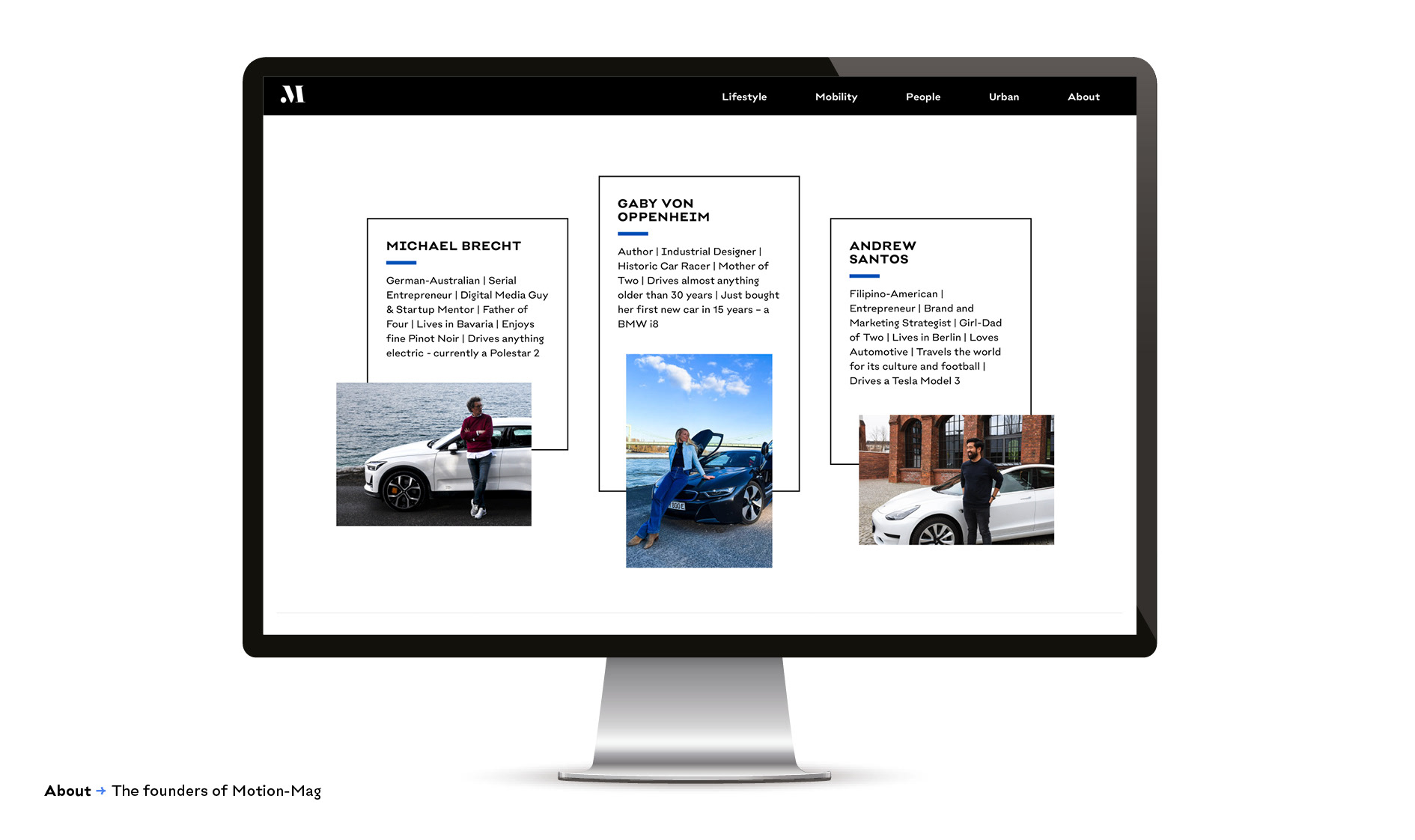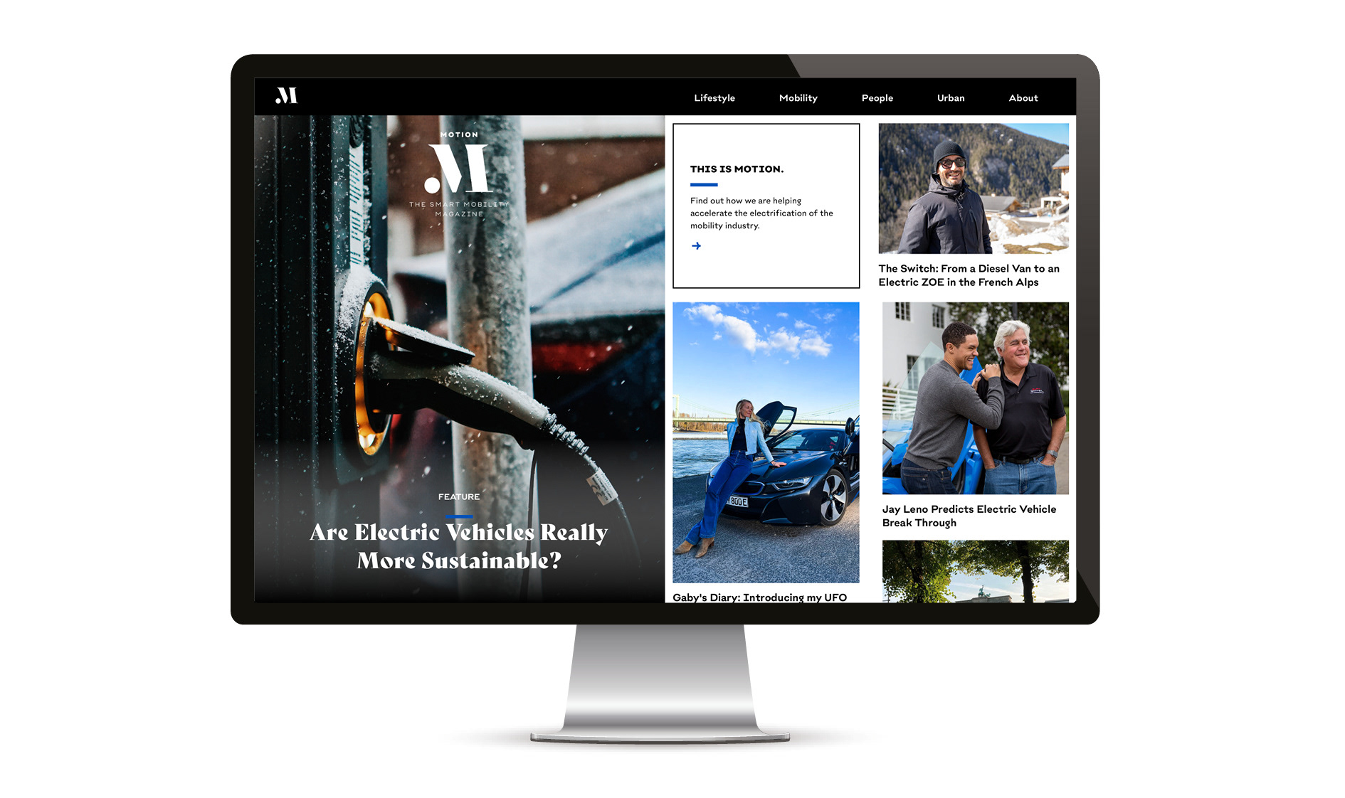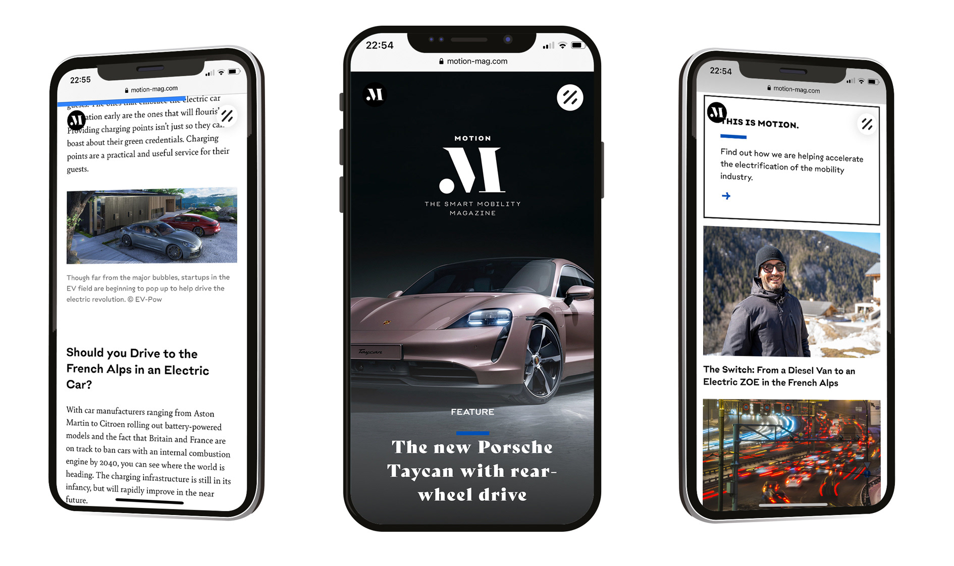 MOTION Magazine, the first international platform on smart mobility that captures the lifestyle, emotional and environmental side of the industry's electrification. MOTION's aim is to accompany you through your journey toward electrification from a lifestyle and cultural approach. In cooperation with Patrick Weseloh we developed a modular Corporate Design for the brand, the digital magazine and its editorial and visual content.