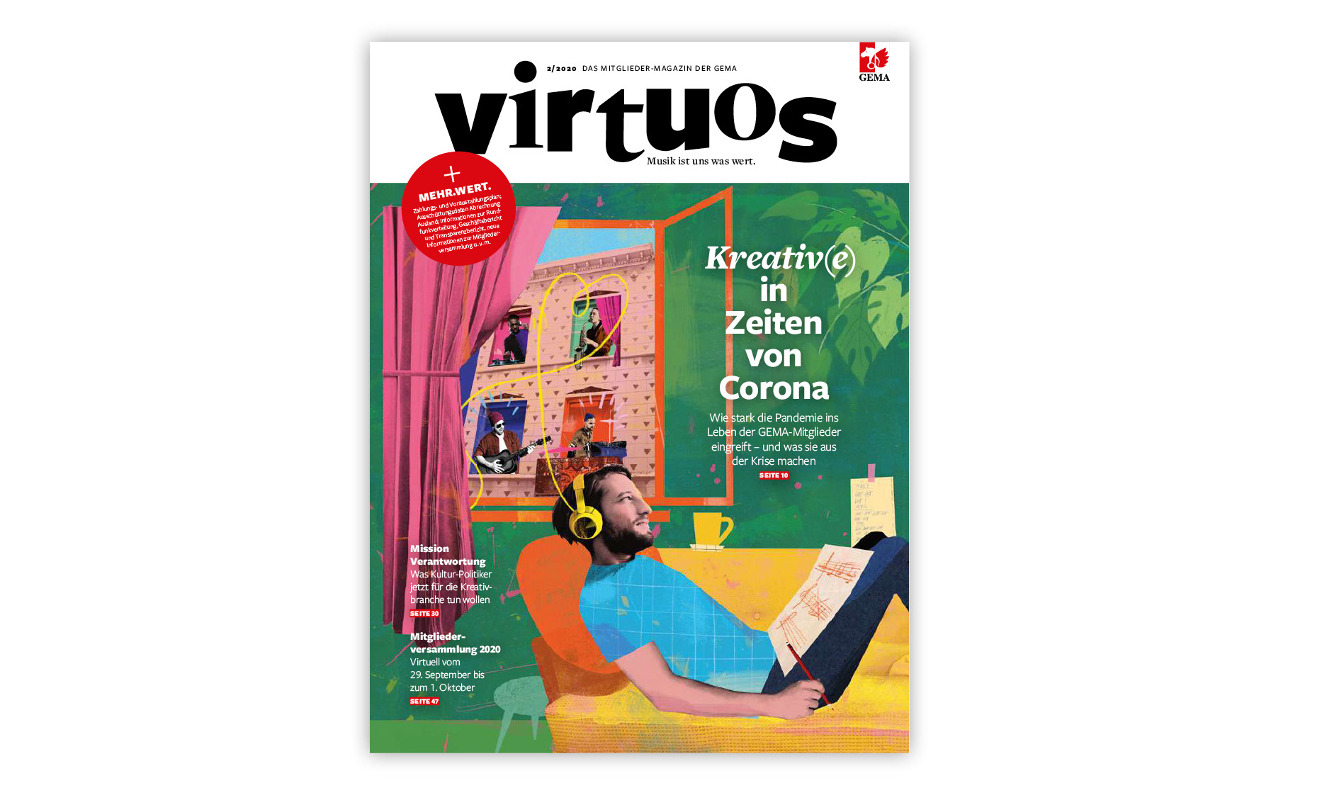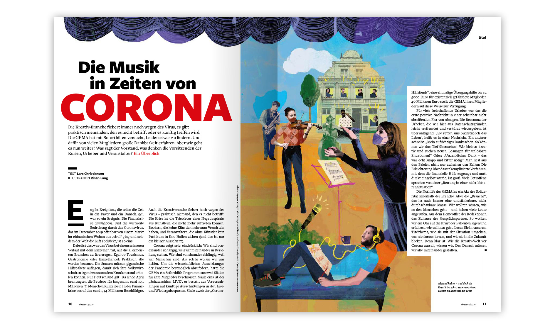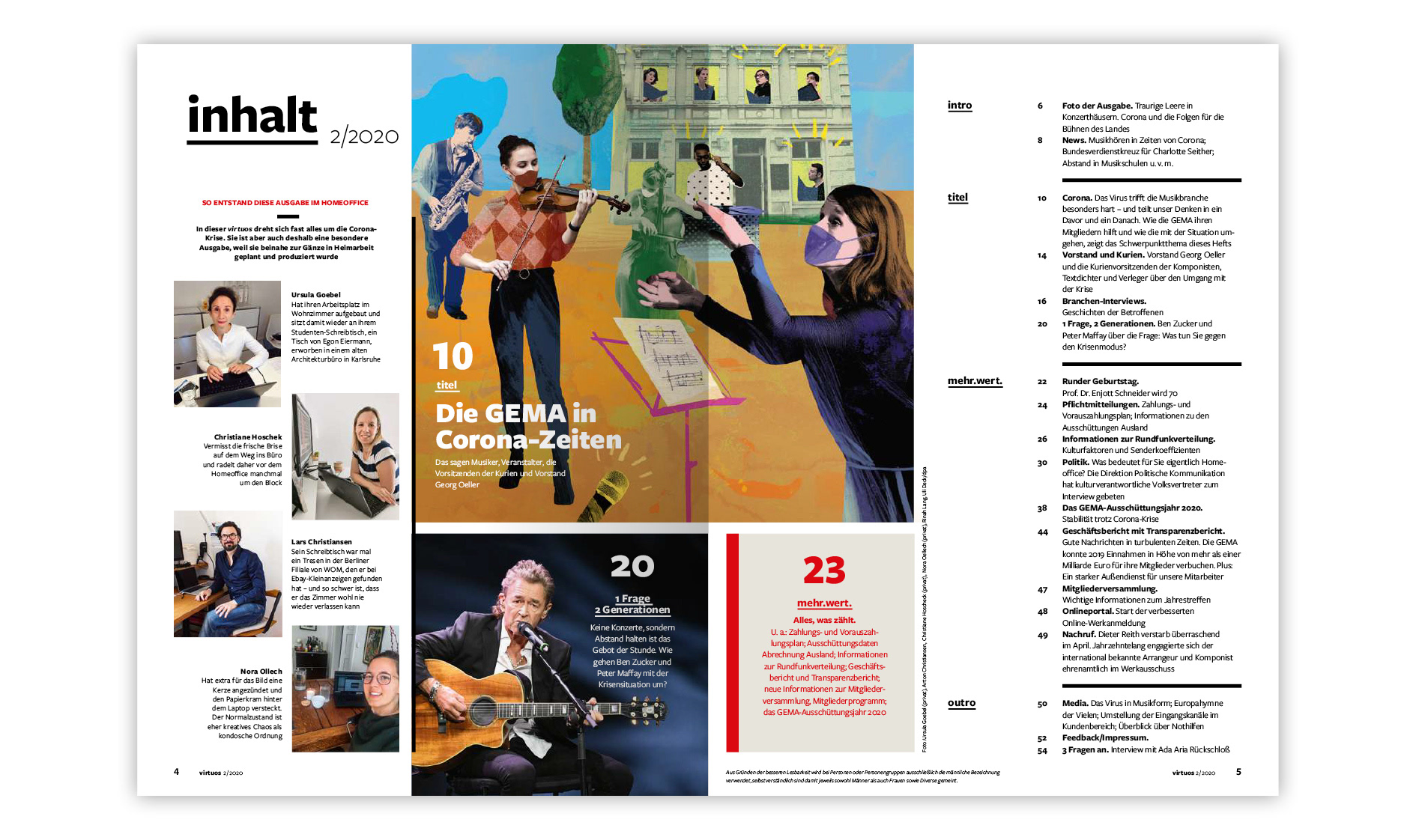 Art Direction and production for the Virtuos Magazine "Kreative in Zeiten von Corona" by GEMA. Agency: Einhorn Solutions.