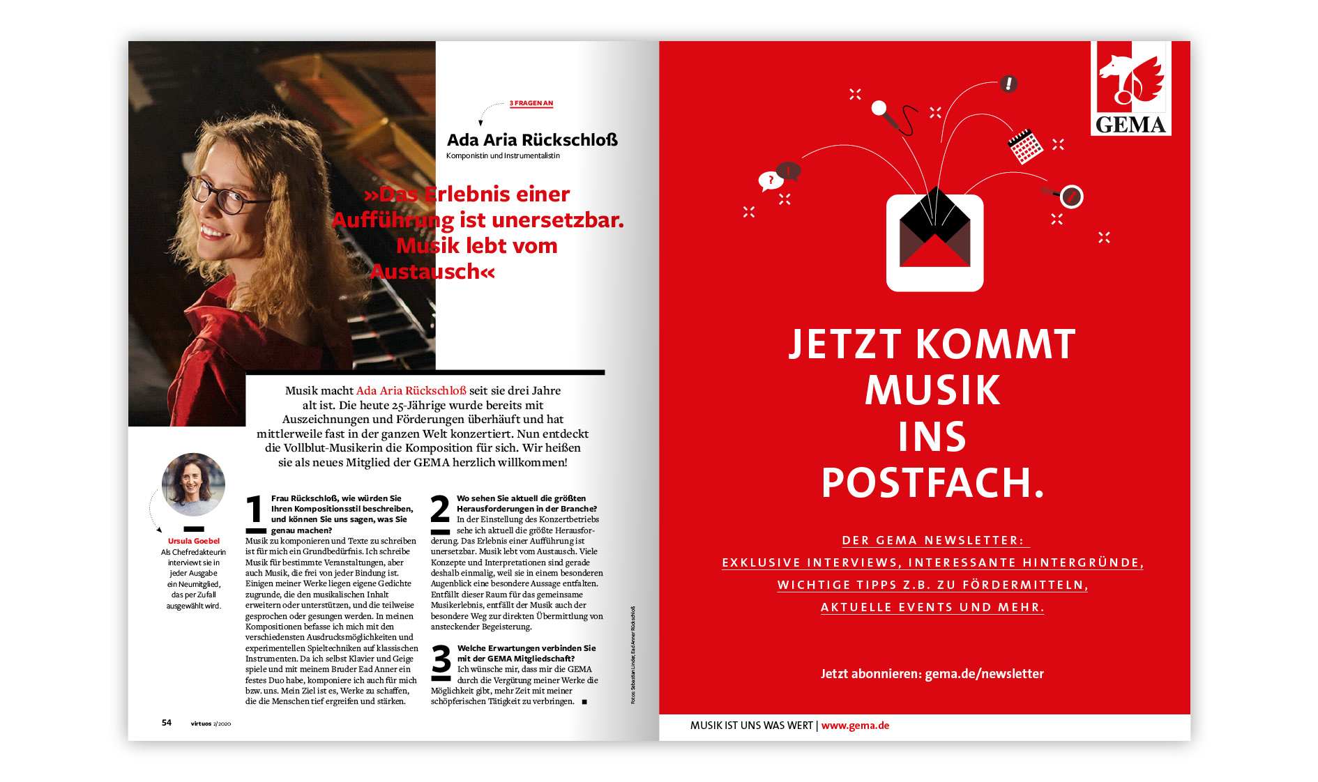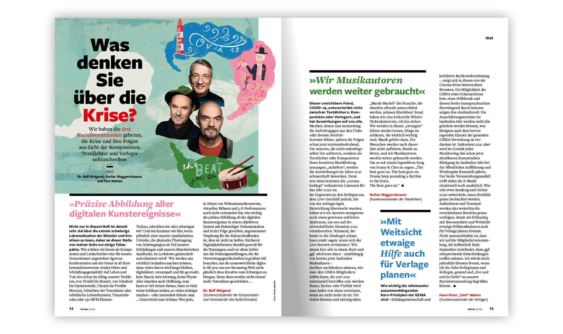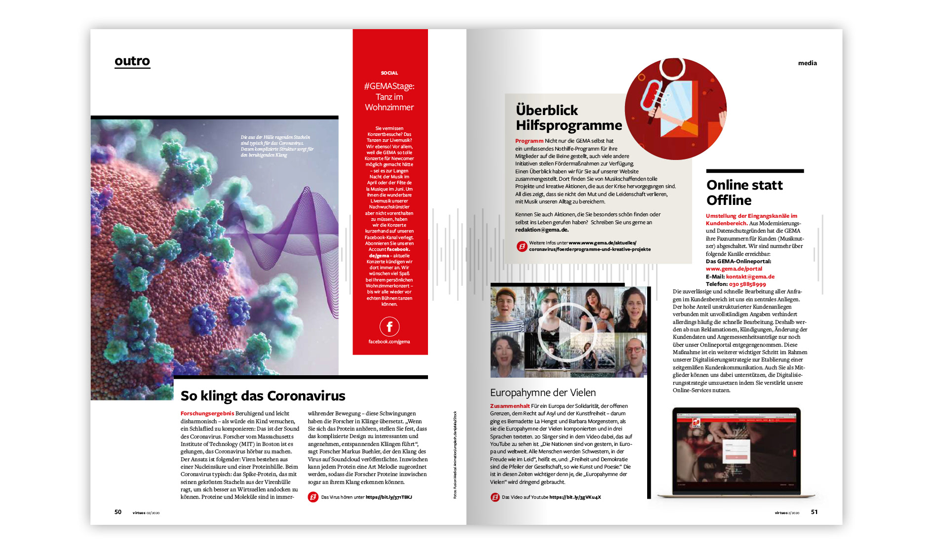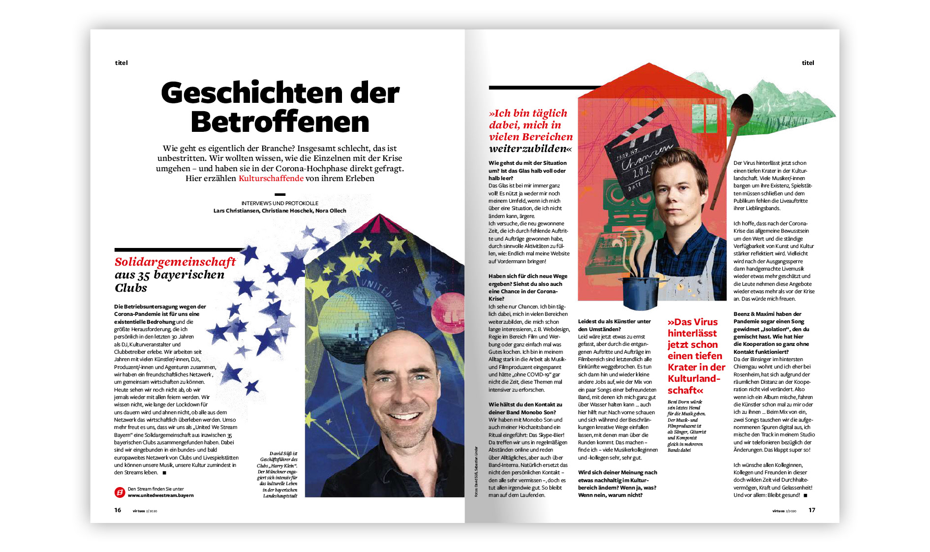 Art Direction and production for the Virtuos Magazine "Kreative in Zeiten von Corona" by GEMA. Agency: Einhorn Solutions.