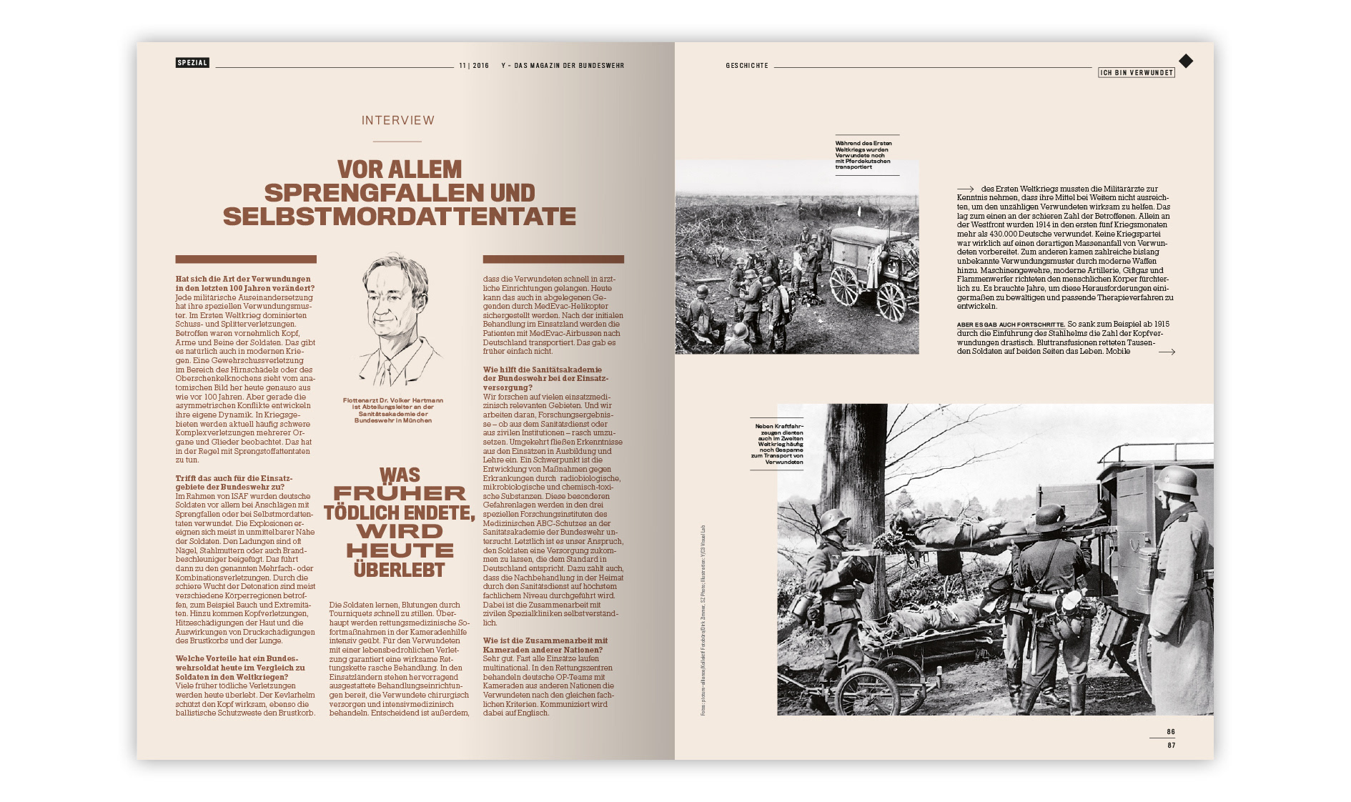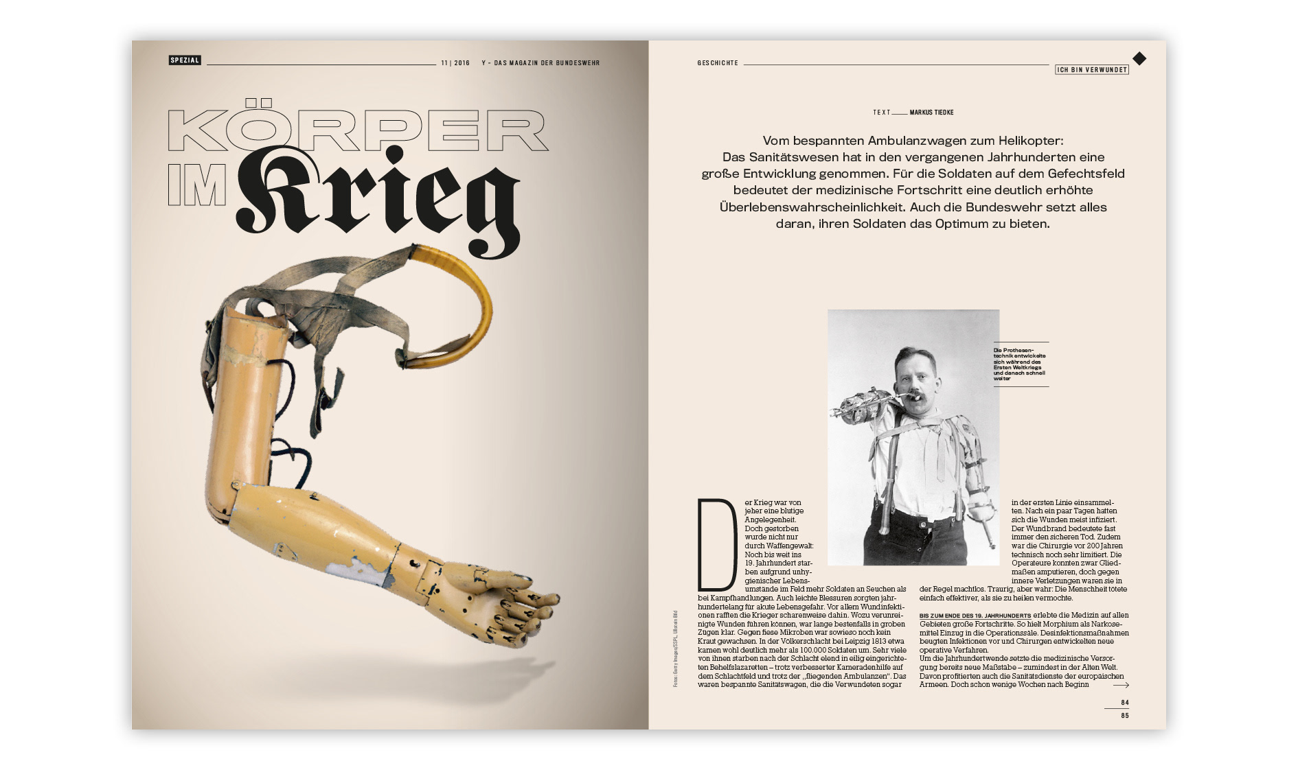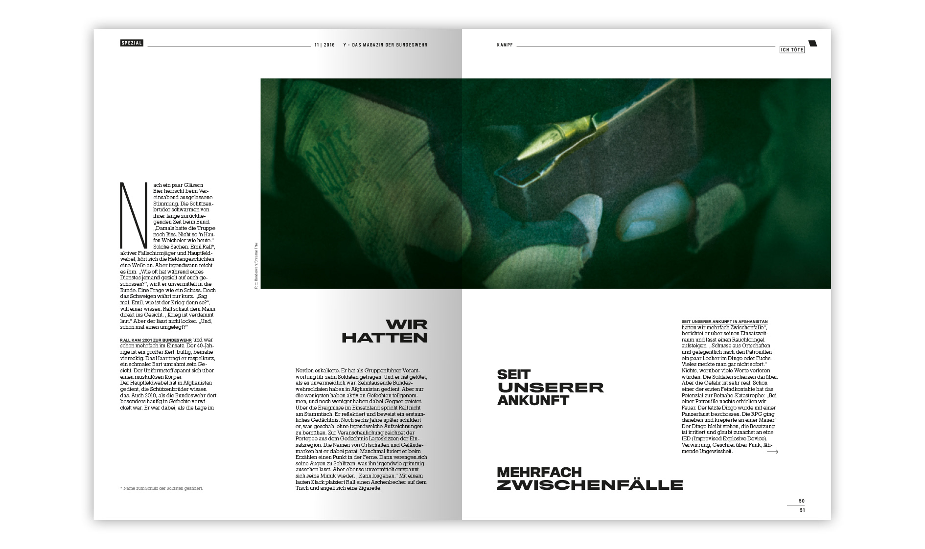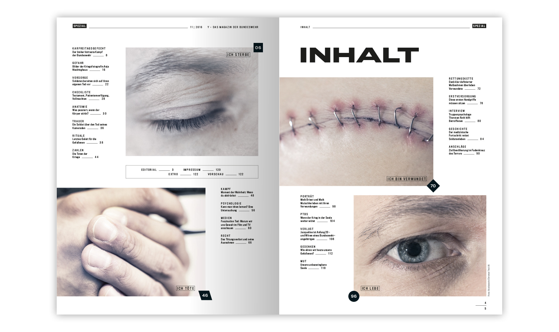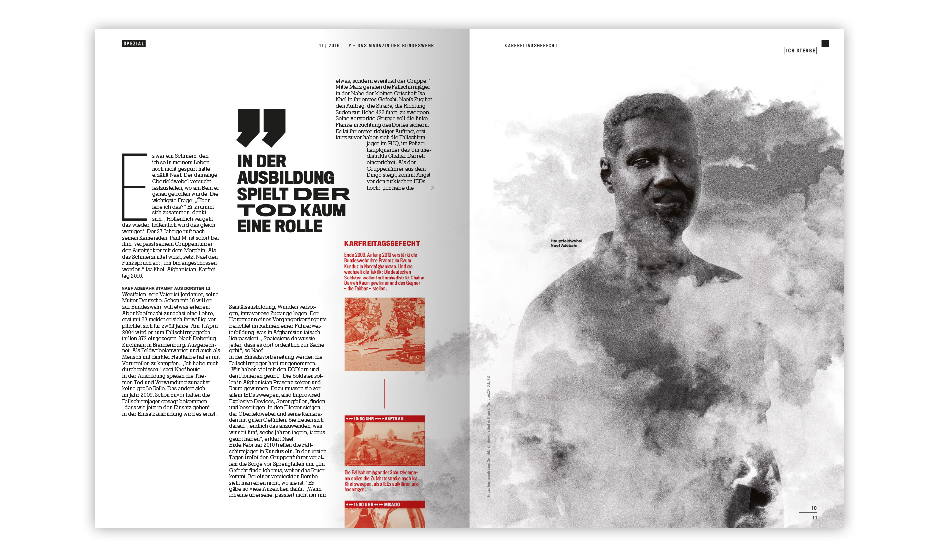 Art Direction for the Y-Magazine "Tod und Verwundung". This is the special edition 2016 of the Federal Ministry of Defense. Agency: C3–Creative Code and Content.