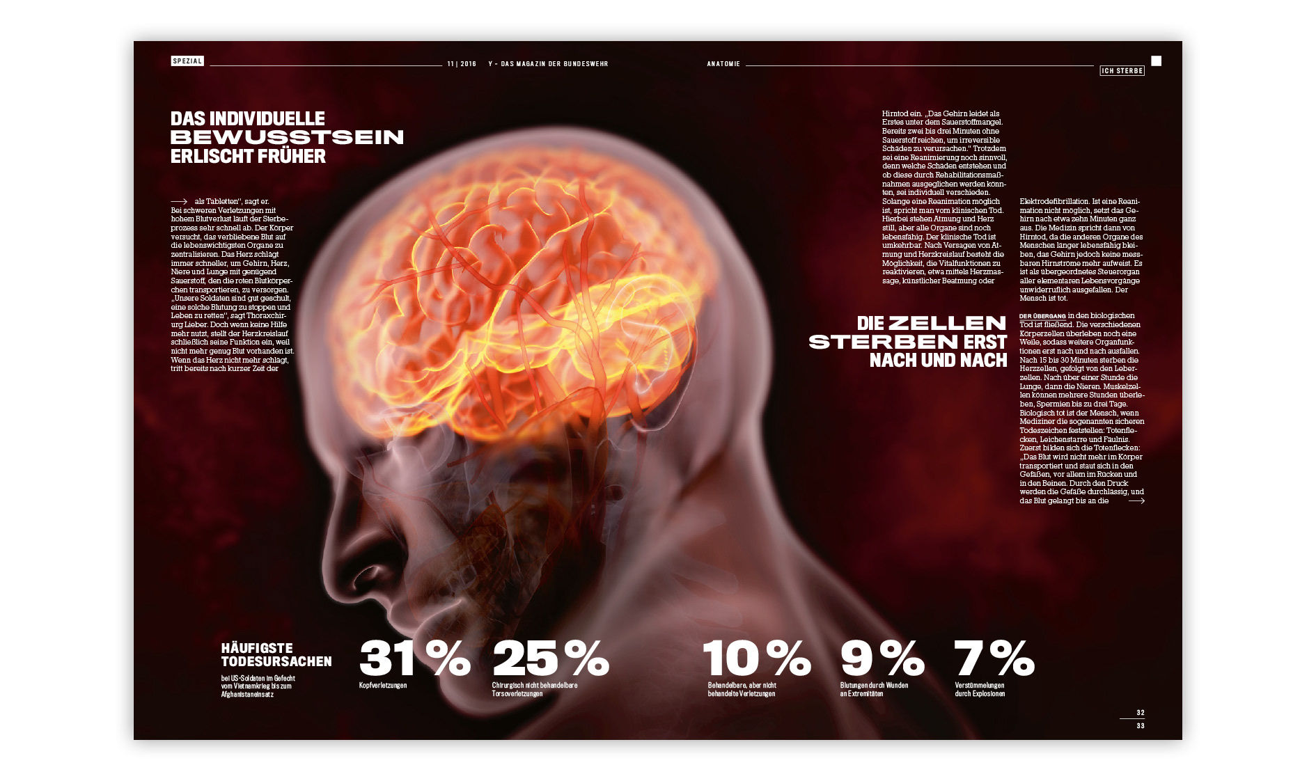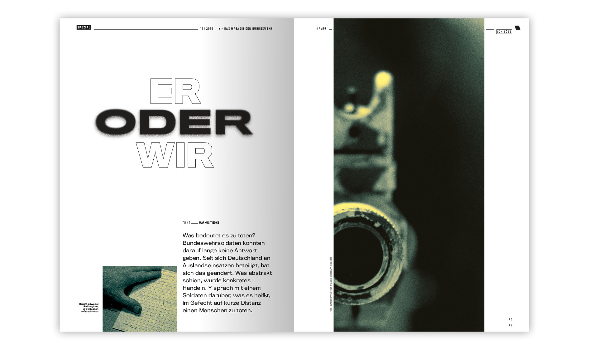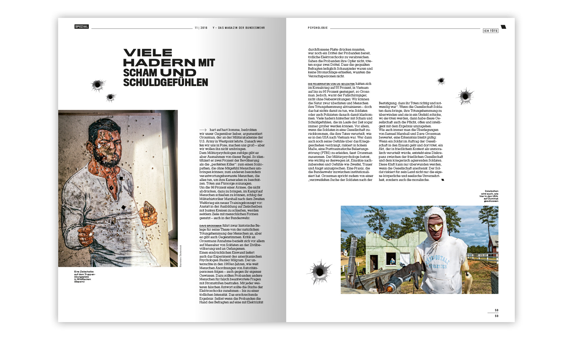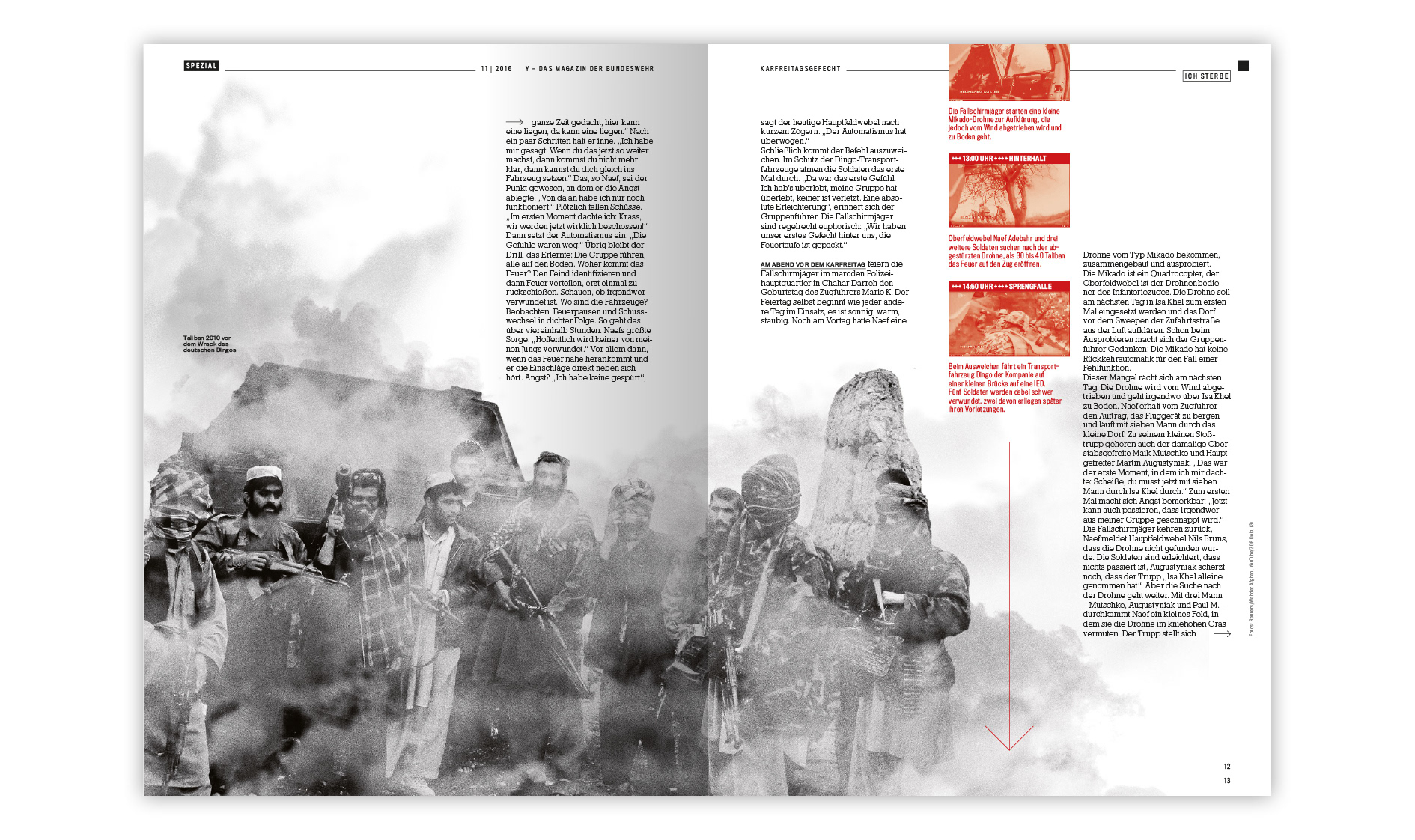 Art Direction for the Y-Magazine "Tod und Verwundung". This is the special edition 2016 of the Federal Ministry of Defense. Agency: C3–Creative Code and Content.
