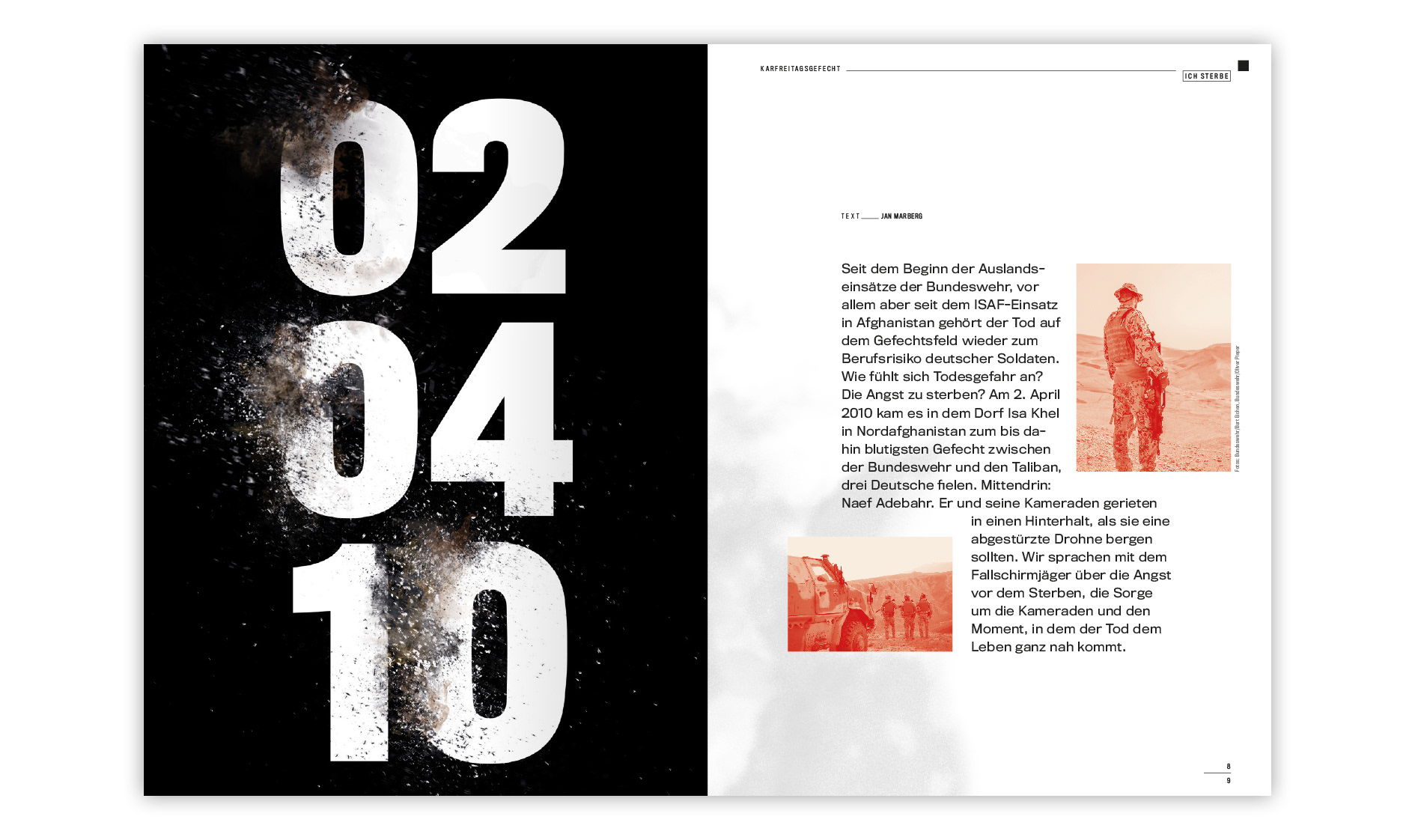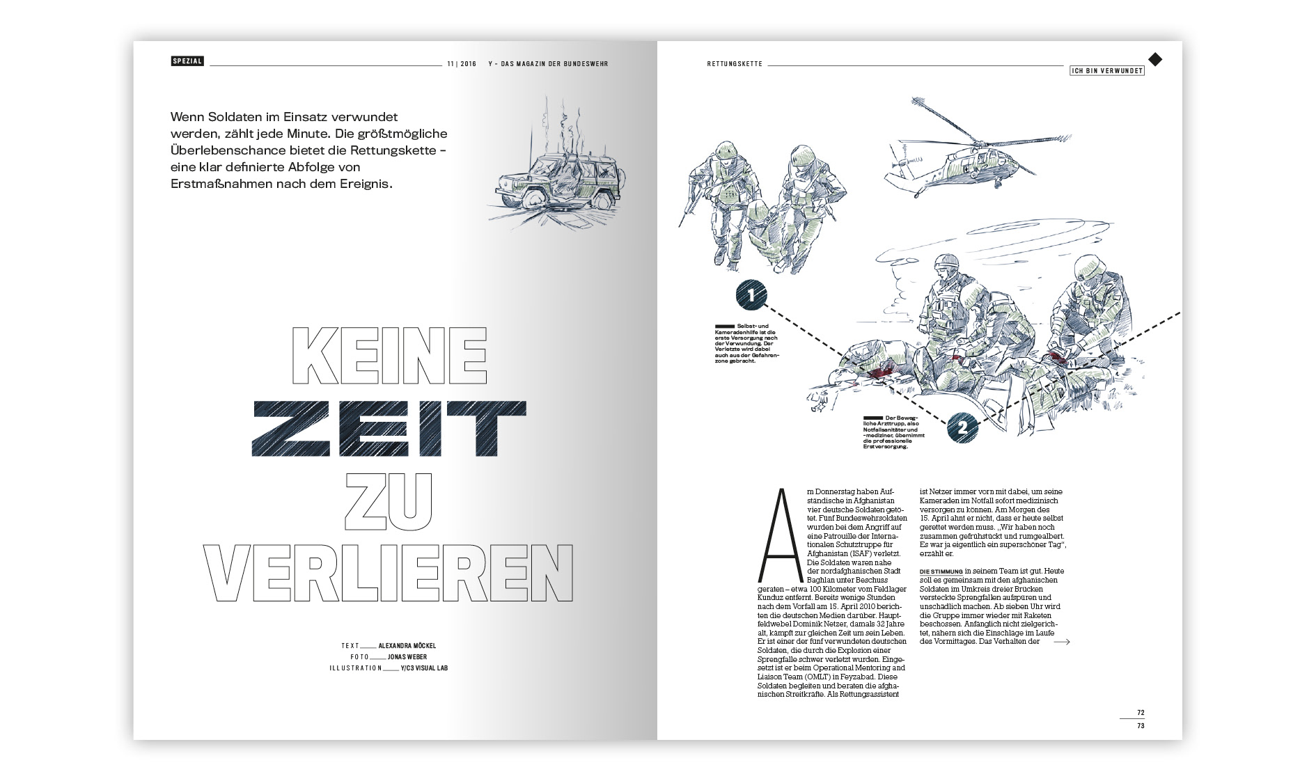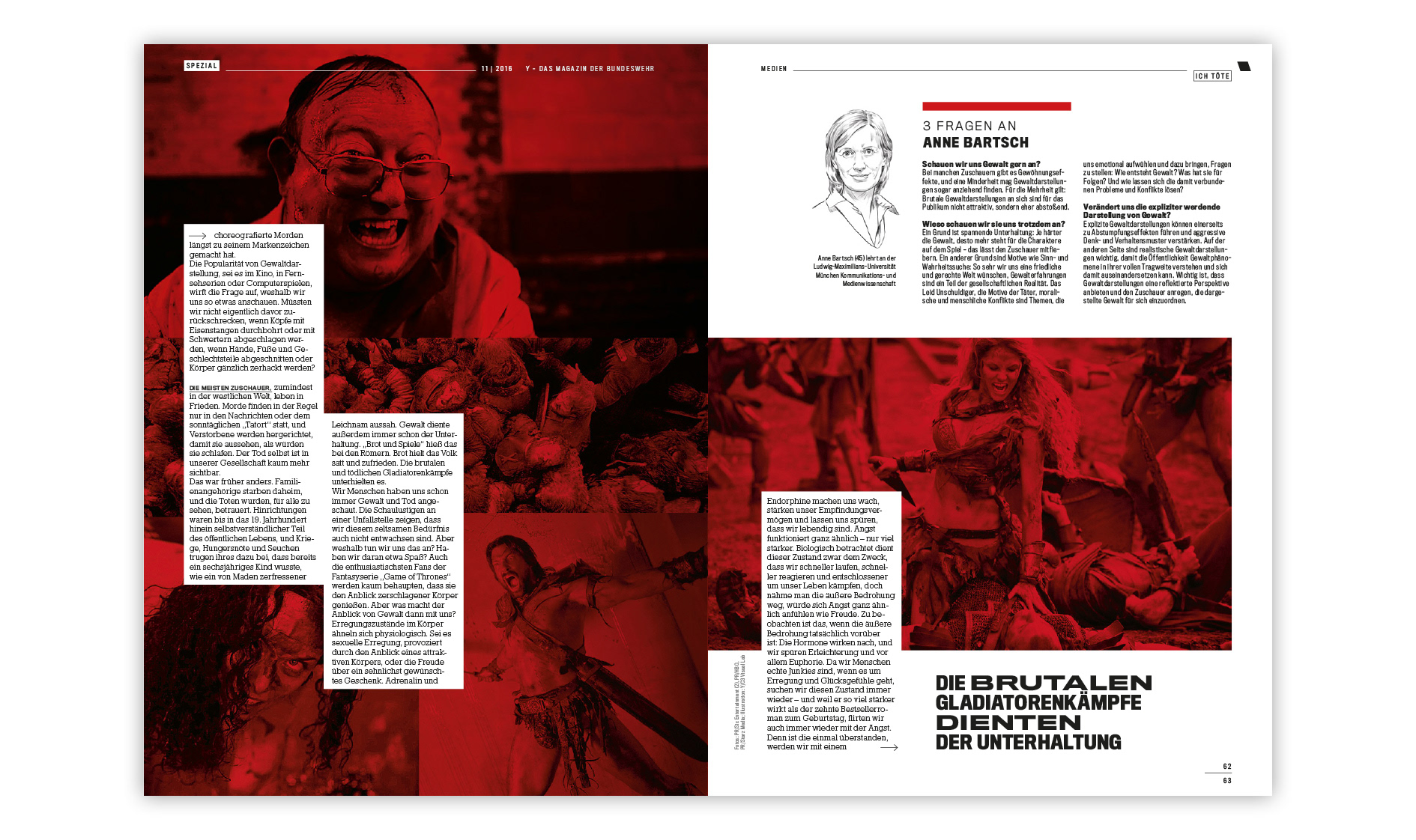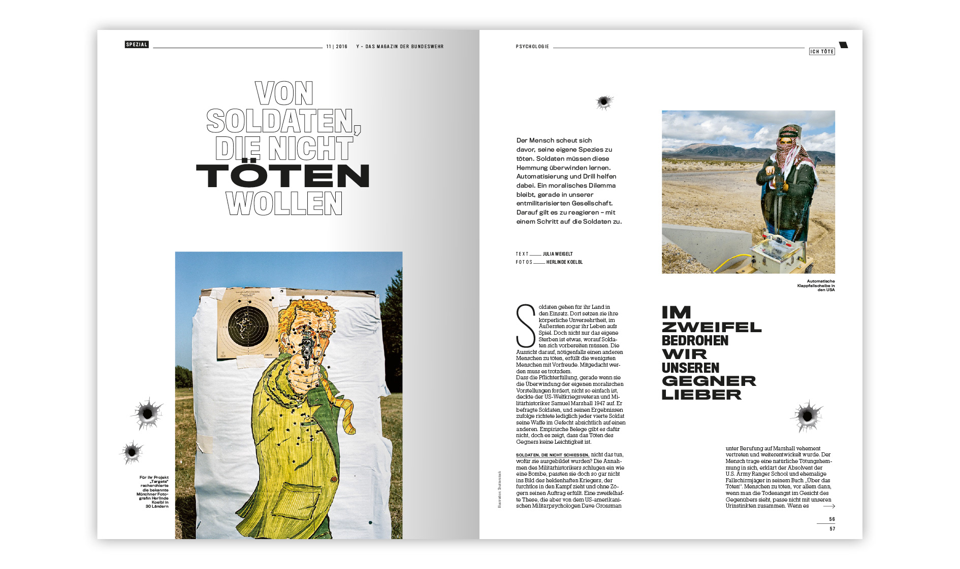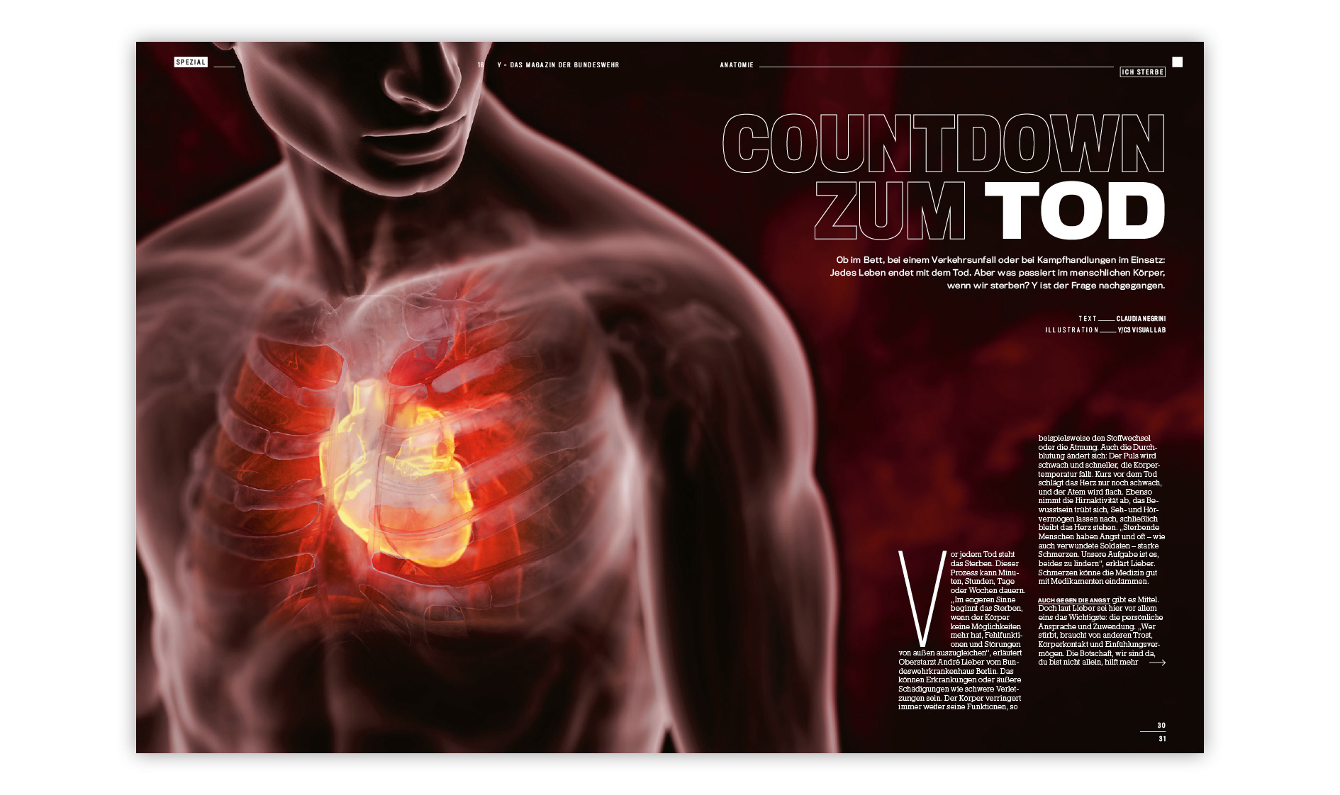Art Direction for the Y-Magazine "Tod und Verwundung". This is the special edition 2016 of the Federal Ministry of Defense. Agency: C3–Creative Code and Content.
